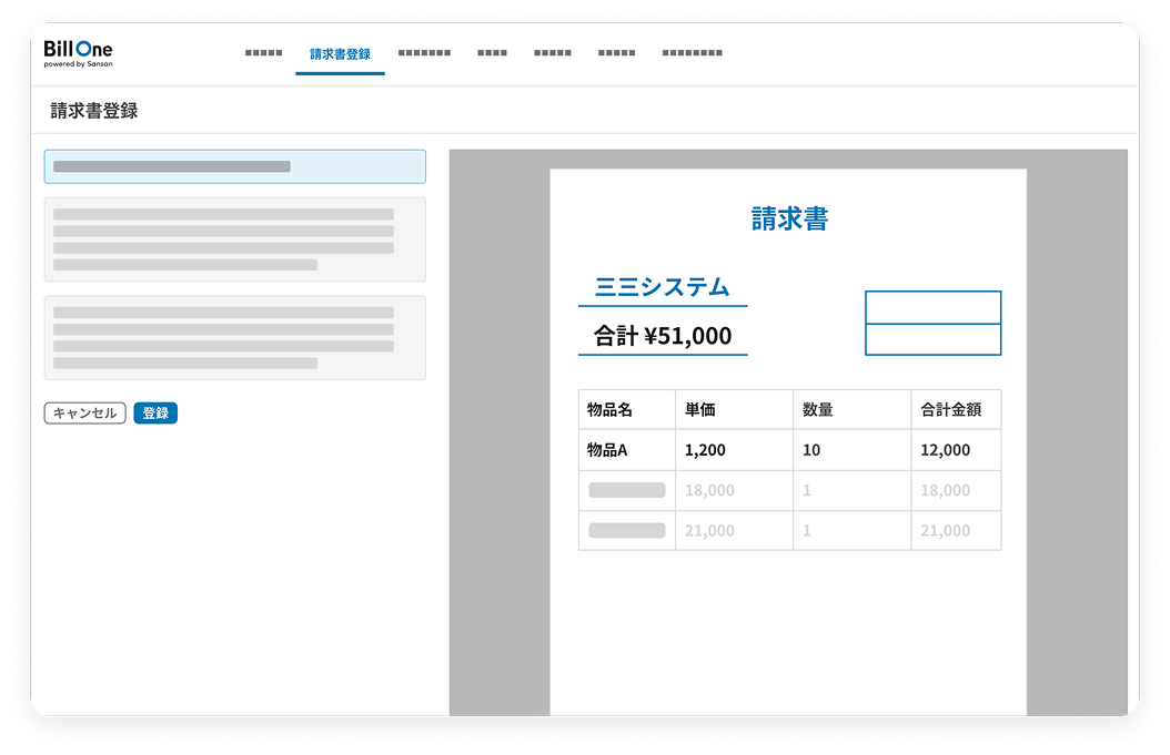 ご利用には、Bill Oneのお申し込みが必要です。Bill Oneは、請求書の受け取りから、照合、申請・承認、保管まで、請求書業務をデジタルで完結できるサービスです。詳しくは、お問い合わせください。