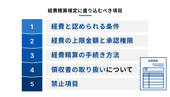 経費精算の規定を作成する際は、重要な項目を網羅的に盛り込む必要があります。ここでは、規定に含めるべき基本的な項目について解説します。